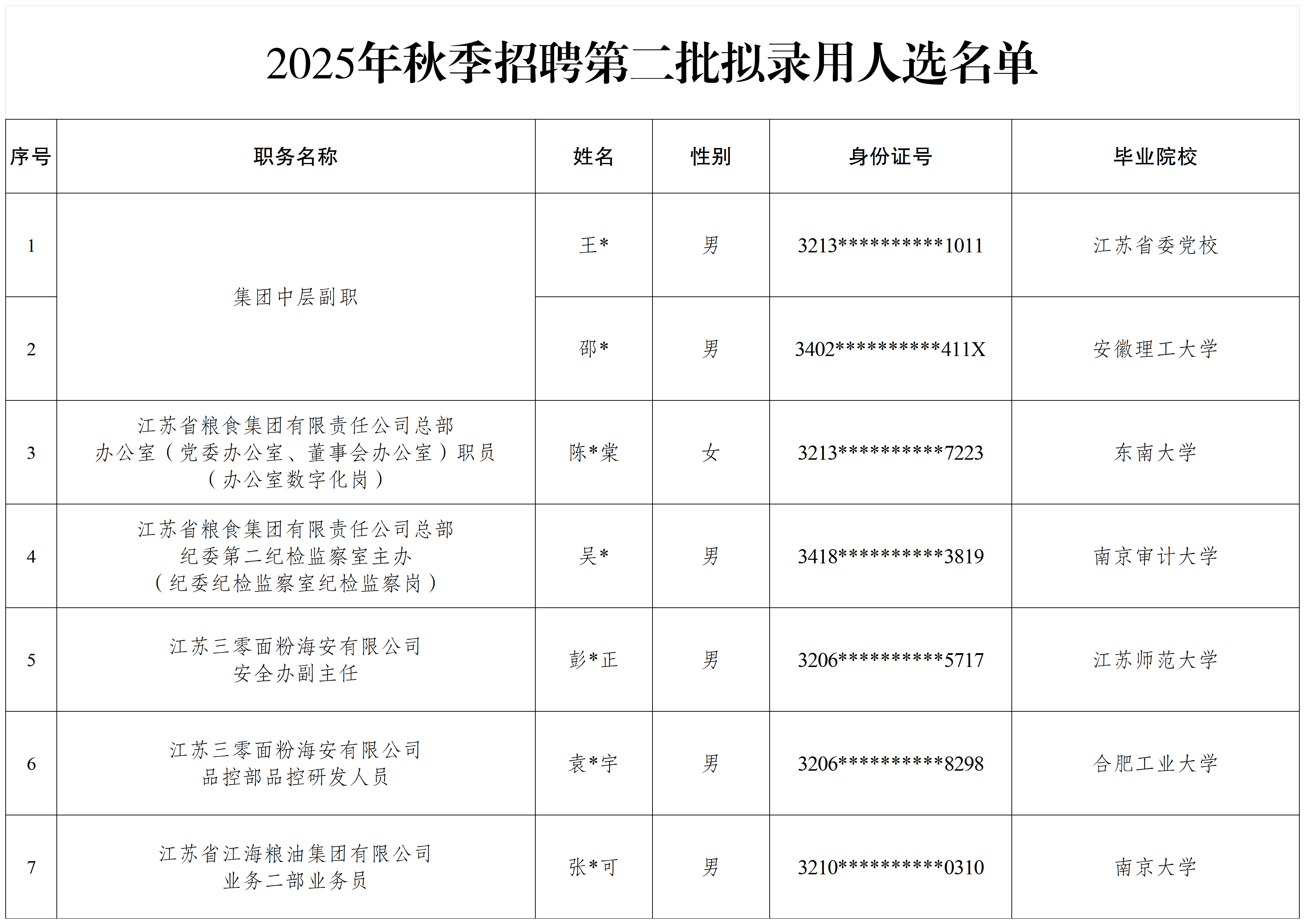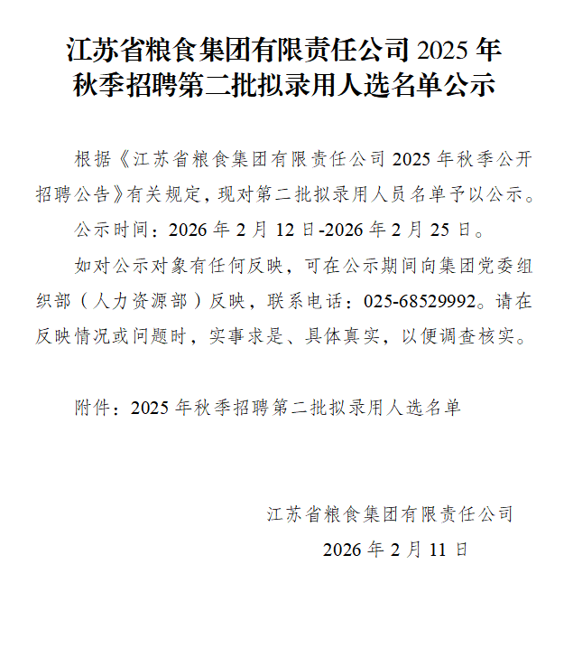 江蘇省糧食集團有限責任公司2025年秋季招聘第二批擬錄用人選名單公示